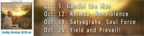 - 10:30 a.m. Livestream & In-Person Service – We continue our series on The Wisdom of Gandhi: 7 Weeks to a Full, Rich, Purposeful Life with Jon West exploring “Ahimsa, Nonviolence.”